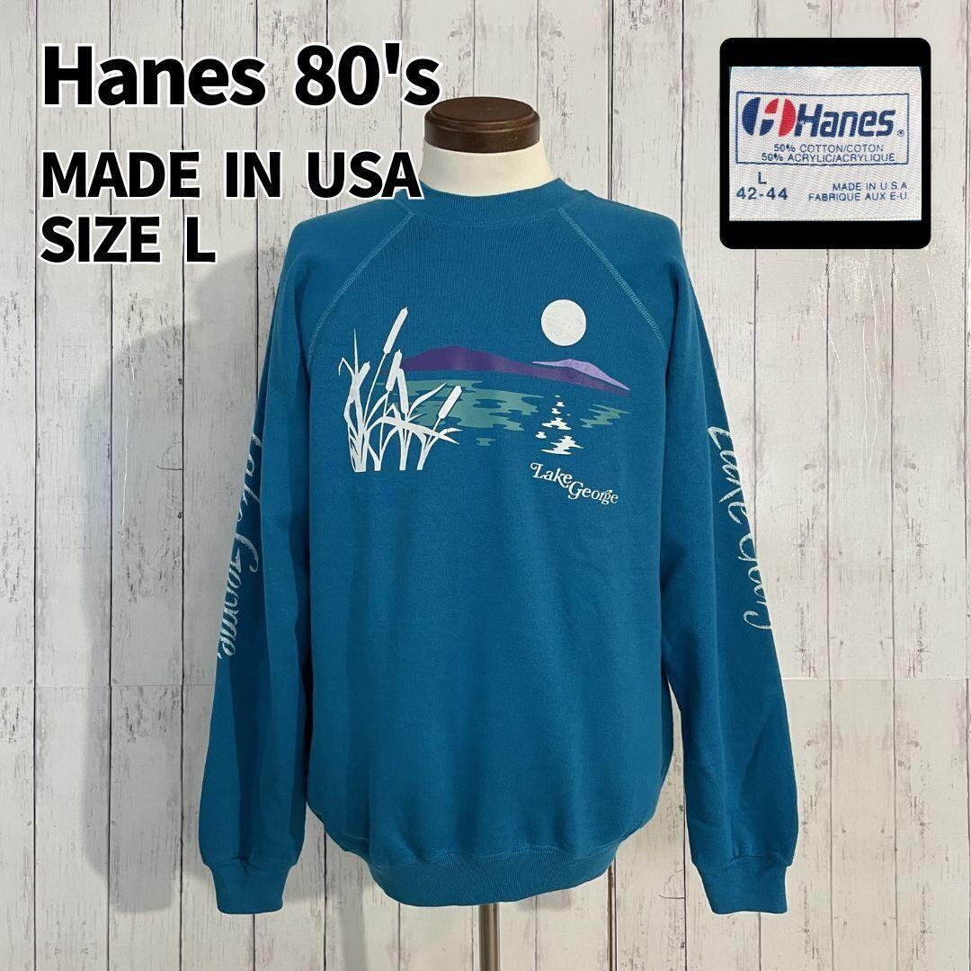 【一点物】Hanes ヘインズ 80年代 ヴィンテージ スーベニア スウェットシャツ ラグランスリーブ アメリカ製 ブルー Lサイズ[SJ0024]